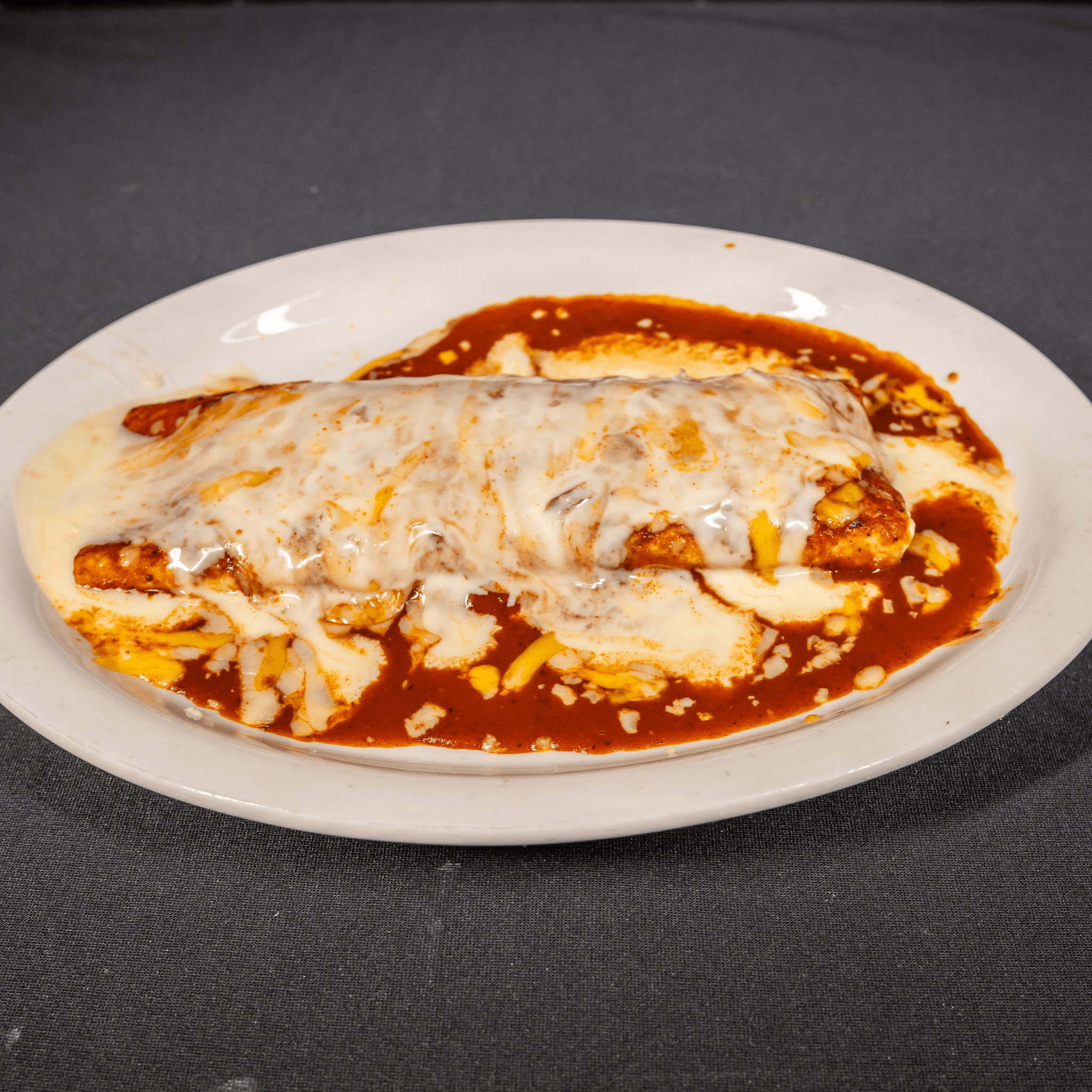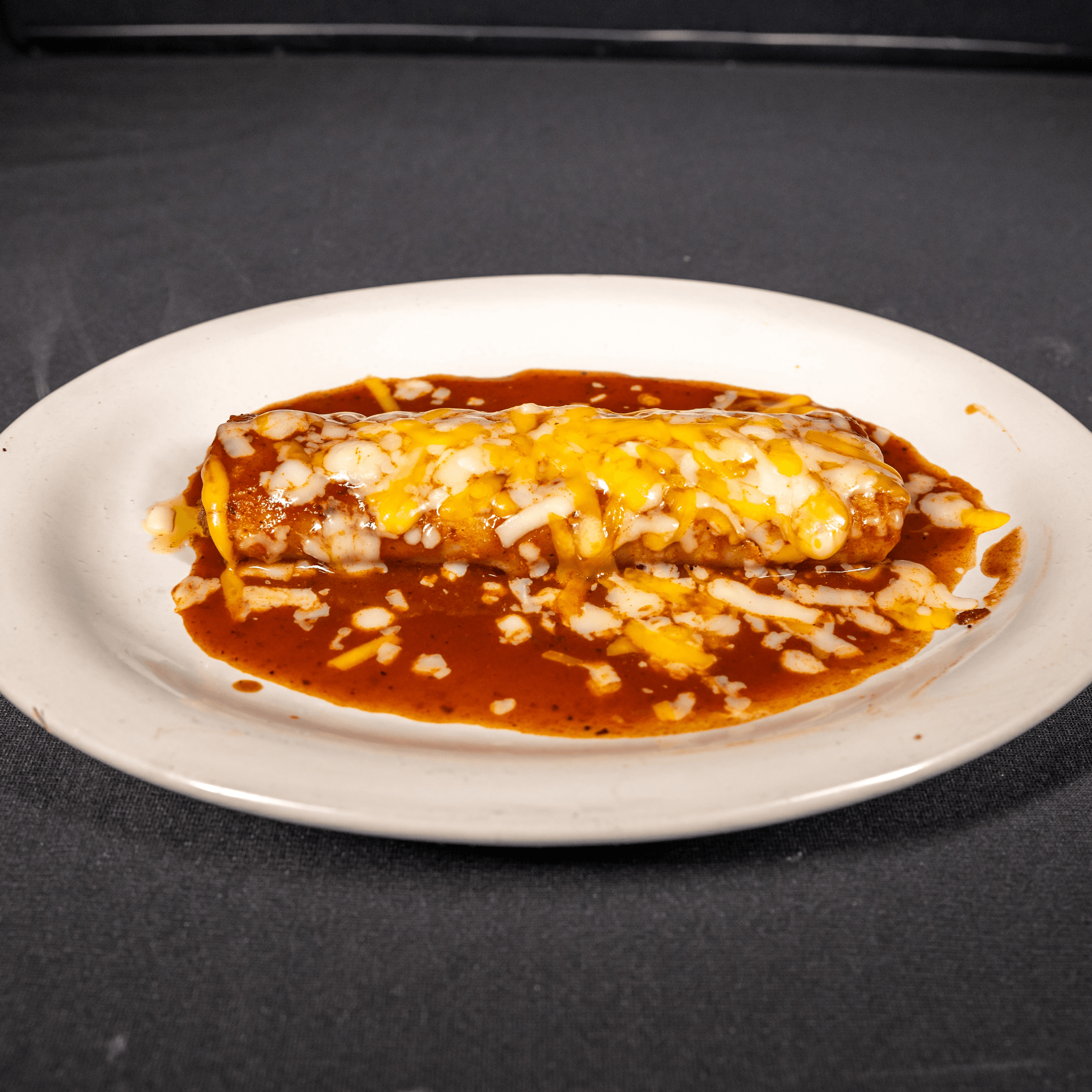 Flour tortilla rolled around beef & beans topped with enchilada sauce & melted cheese