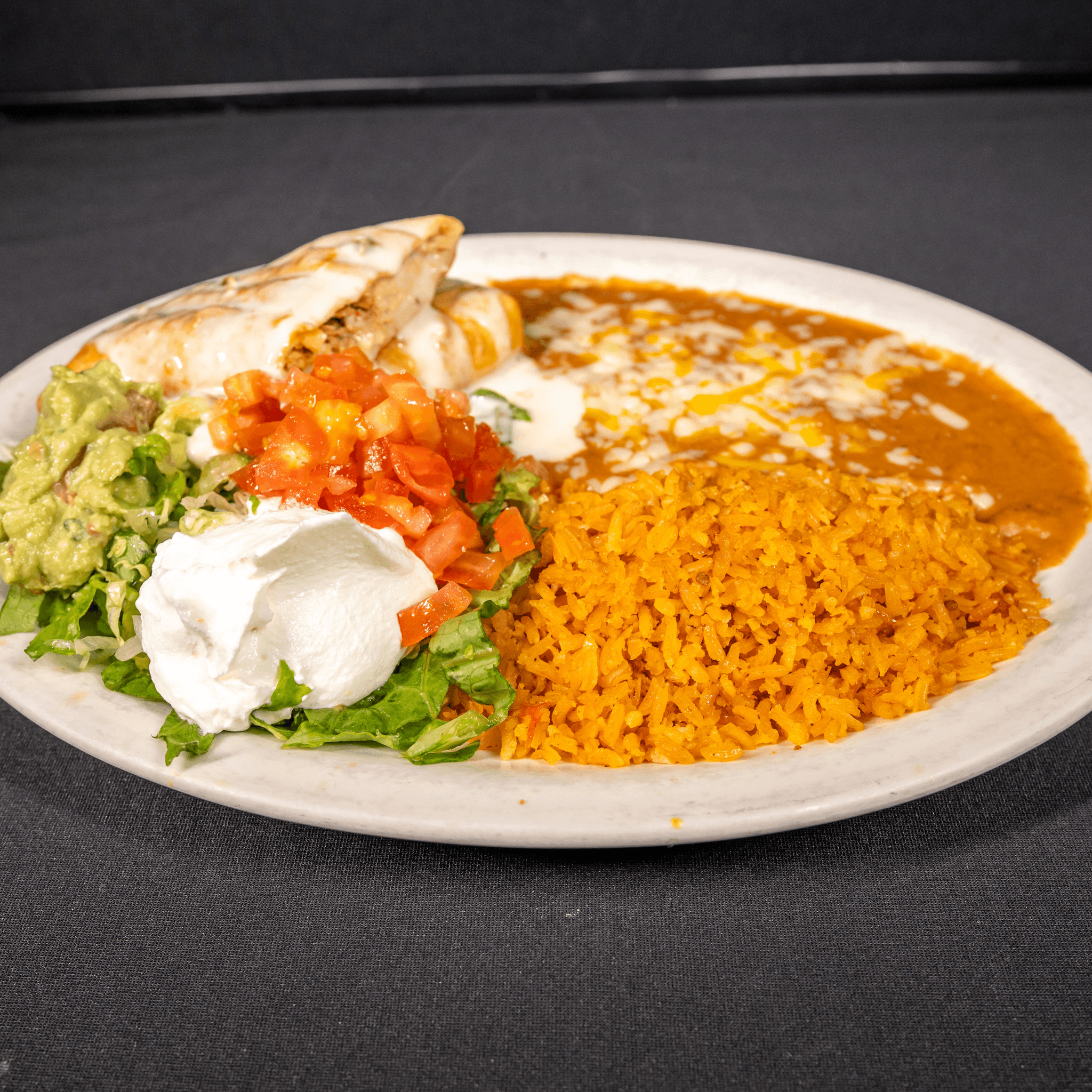 One flour tortilla rolled with ground beef & beans, topped with cheese, lettuce, tomatoes, guacamole, sour cream & rice on the side