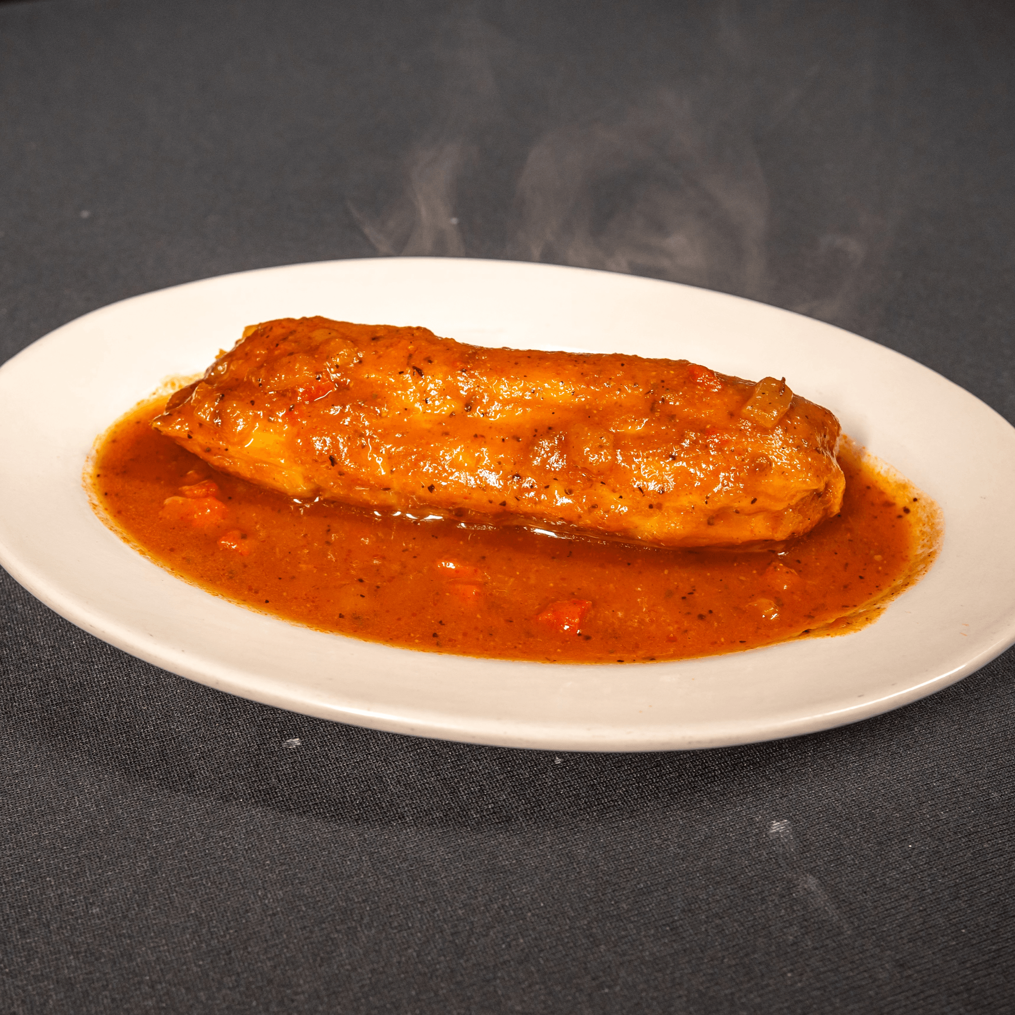 Fresh grilled fish fillet, covered with veracruzana sauce. Served with rice, steamed vegetables & garlic bread