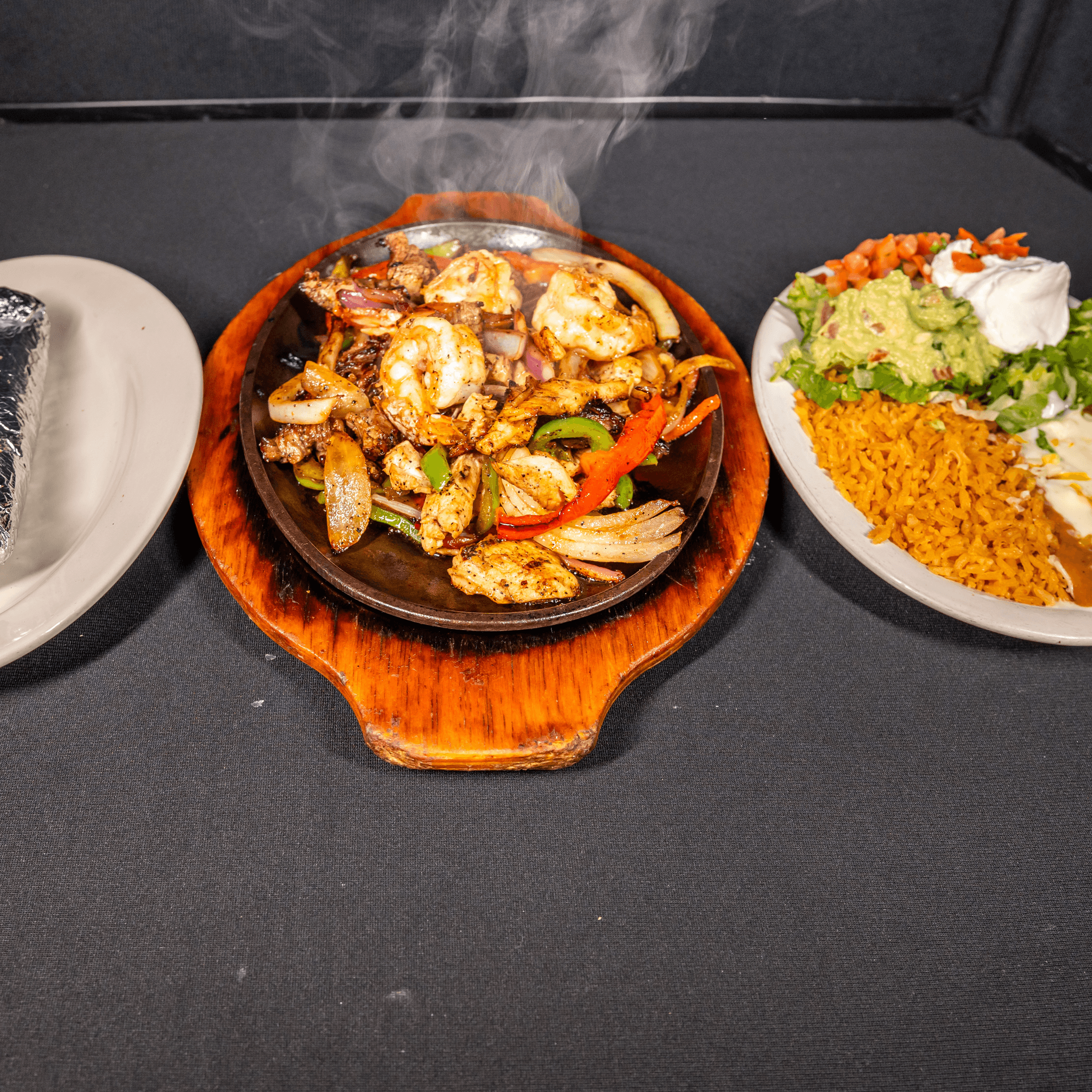 A combination of chicken, steak & shrimp sizzling with onions & bell peppers, with lettuce, pico de gallo, sour cream, guacamole & flour or corn tortillas; served with rice & charro or refried beans