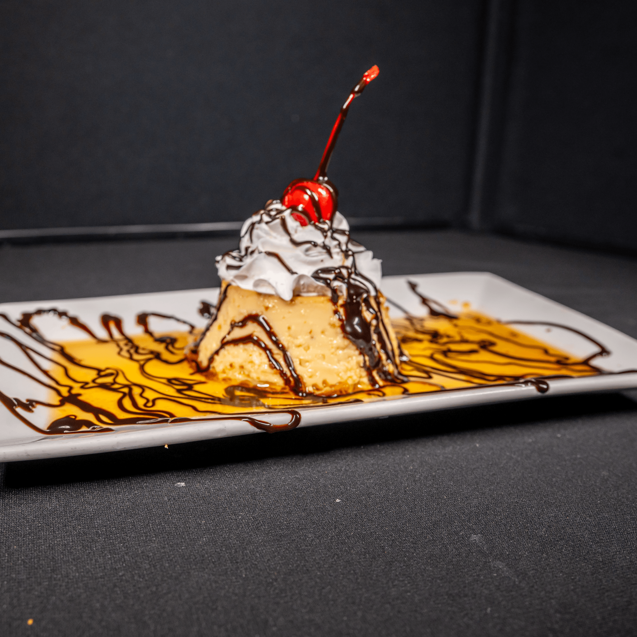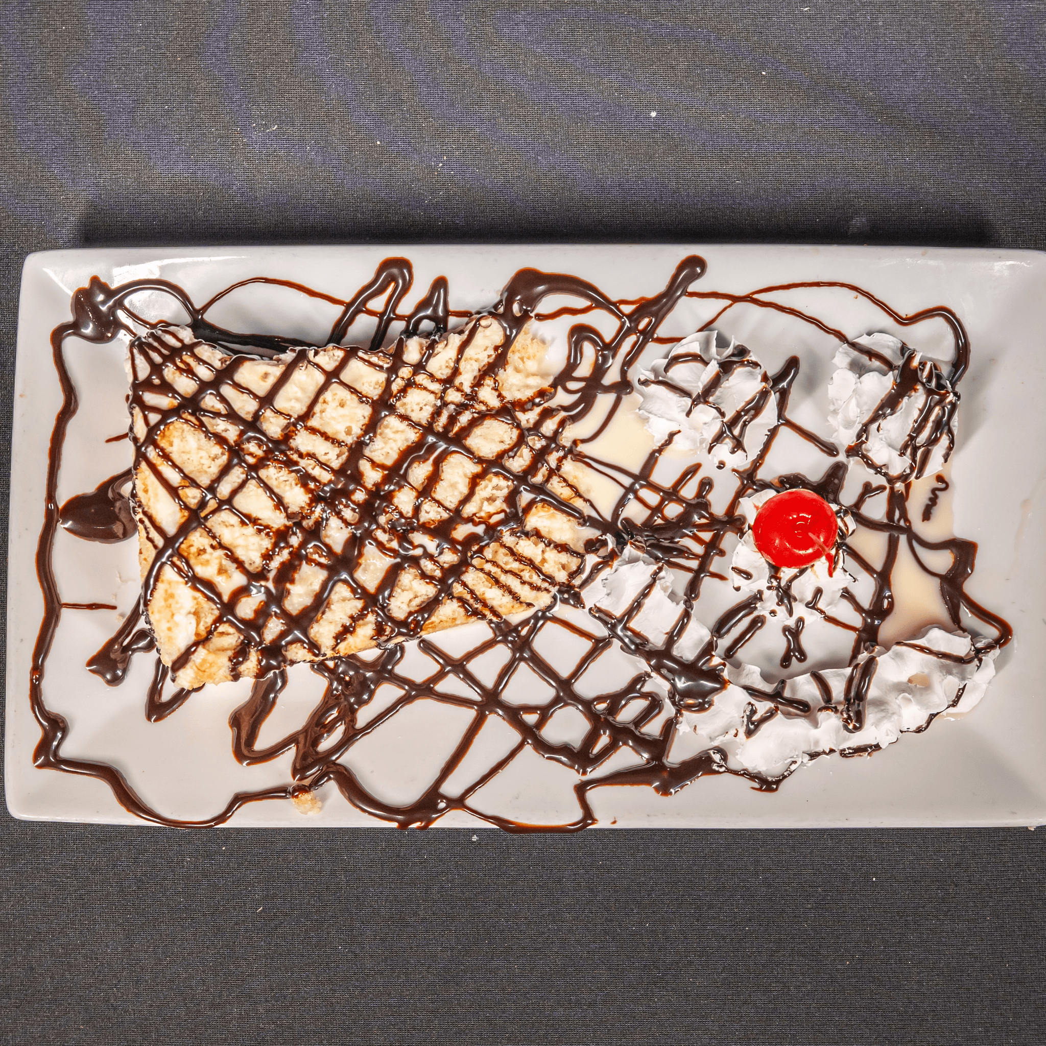 A spongy, sweet cake made with a combination of condensed milk, evaporated milk and regular milk, served with whipped cream & chocolate syrup