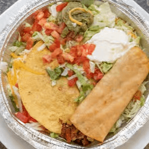Fried flour tortilla shell filled with lettuce, topped with cheese, guacamole & sour cream