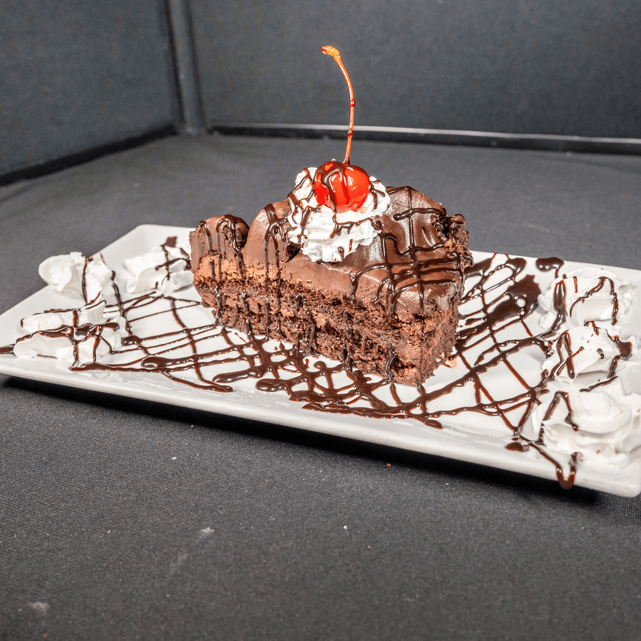 A thick slice of moist, delicious chocolate cake